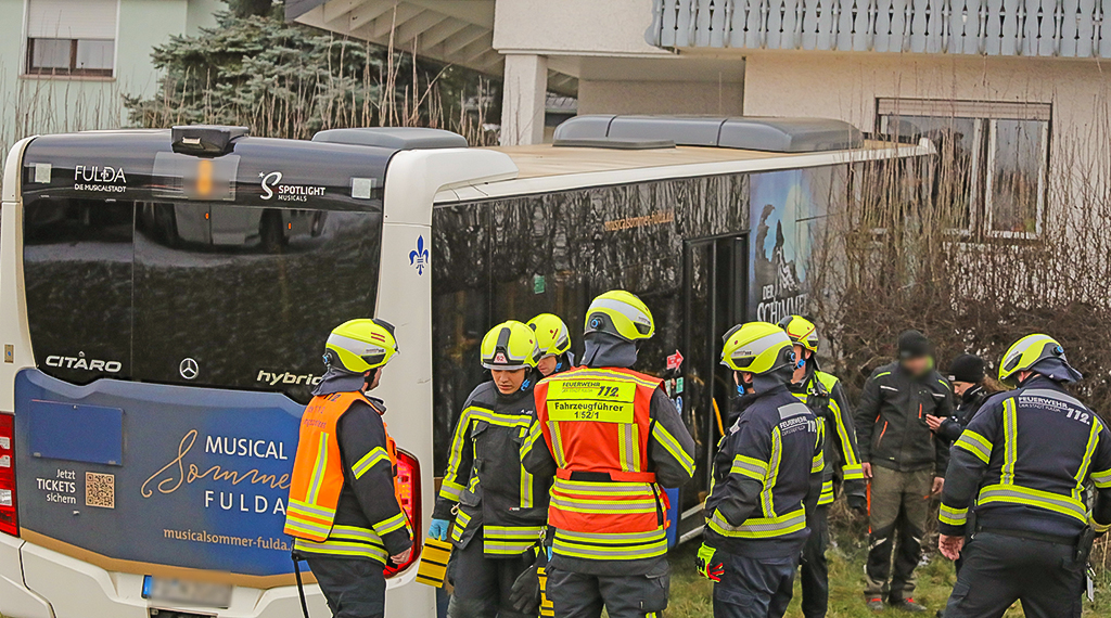 Ein dramatischer Unfall hat am Samstagmorgen gegen 9.15 Uhr den Gerloser Weg in Fulda-Niesig erschüttert. Ein 65-jähriger Fahrer eines Stadtbusses verlor aus bislang ungeklärter Ursache die Kontrolle über sein Fahrzeug. Der Bus kam von der Fahrbahn ab, überquerte eine Wiese und krachte schließlich gegen eine Hauswand. Für den Fahrer wurde es dabei brenzlig: Der 65-Jährige wurde im Bus eingeklemmt und konnte sich nicht selbst befreien. Die alarmierte Feuerwehr rückte umgehend an, befreite den verletzten Mann aus seiner misslichen Lage und übergab ihn anschließend dem Rettungsdienst zur weiteren Versorgung. Glück im Unglück: Fahrgäste befanden sich zum Zeitpunkt des Unfalls nicht im Bus. Wie es zu dem Unfall kommen konnte und wie hoch der entstandene Schaden ist, steht derzeit noch nicht fest. Die Feuerwehren Fulda Mitte und Fulda Nord waren mit über 20 Einsatzkräften vor Ort im Einsatz, ebenso der Rettungsdienst und die Polizei, die den Unfall aufnahm und die Ermittlungen zur Ursache aufgenommen hat. +++ adm