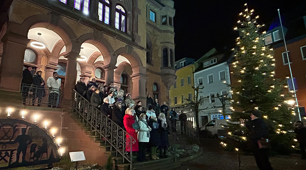 Mit dem traditionellen Neujahrslied haben die Hünfelder das Jahr 2026 willkommen geheißen und gemeinsam das alte Jahr vor dem Rathaus ausklingen lassen. Zahlreiche Bürgerinnen und Bürger waren der Einladung gefolgt, um sich nach der Silvesteransprache von Bürgermeister Benjamin Tschesnok ein frohes neues Jahr zu wünschen und einen Moment des Innehaltens zu teilen. Unter den Rathausarkaden erklang das traditionsreiche Hünfelder Neujahrslied, vorgetragen von einem eigens dafür zusammengestellten Projektchor unter der Leitung von Regionalkantor Christopher Löbens. Instrumental begleitet wurde der Chor von einem Bläserquintett unter der Leitung von Martin Genßler.