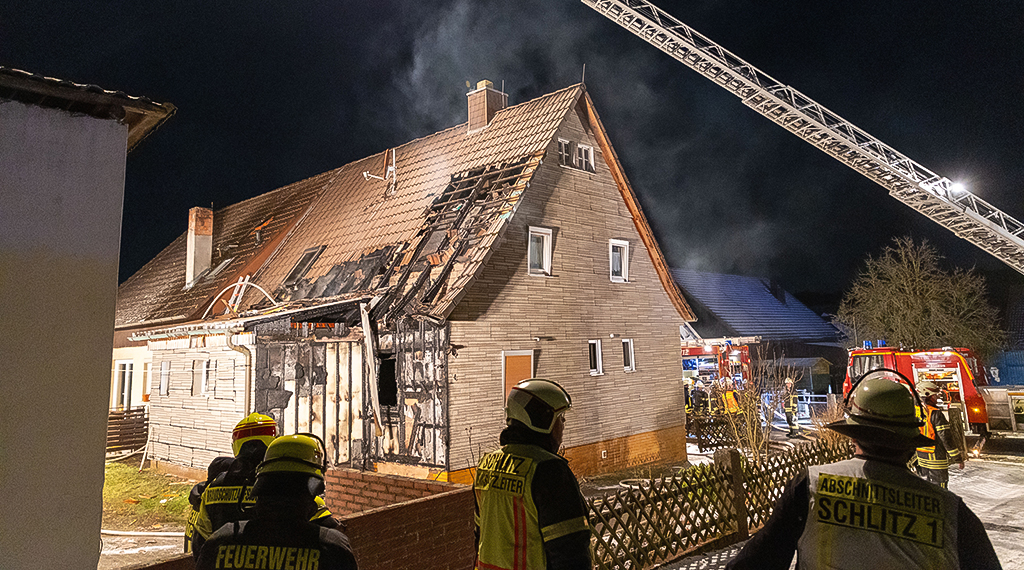 „Wir sind um 0.45 Uhr zum F2, also Feuer 2, unklarer Feuerschein, alarmiert worden“, erklärte Andreas Leinweber, stellvertretender Stadtbrandinspektor der Stadt Schlitz. Nach dem Eintreffen der Einsatzkräfte sei die Lage neu bewertet worden. „Nach dem Eintreffen haben wir dann direkt auf Feuer 3, also eine Stichworterhöhung gemacht und haben einen Brand vorgefunden, der vermutlich im Außenbereich angefangen und sich am Dach hochgezogen hat.“