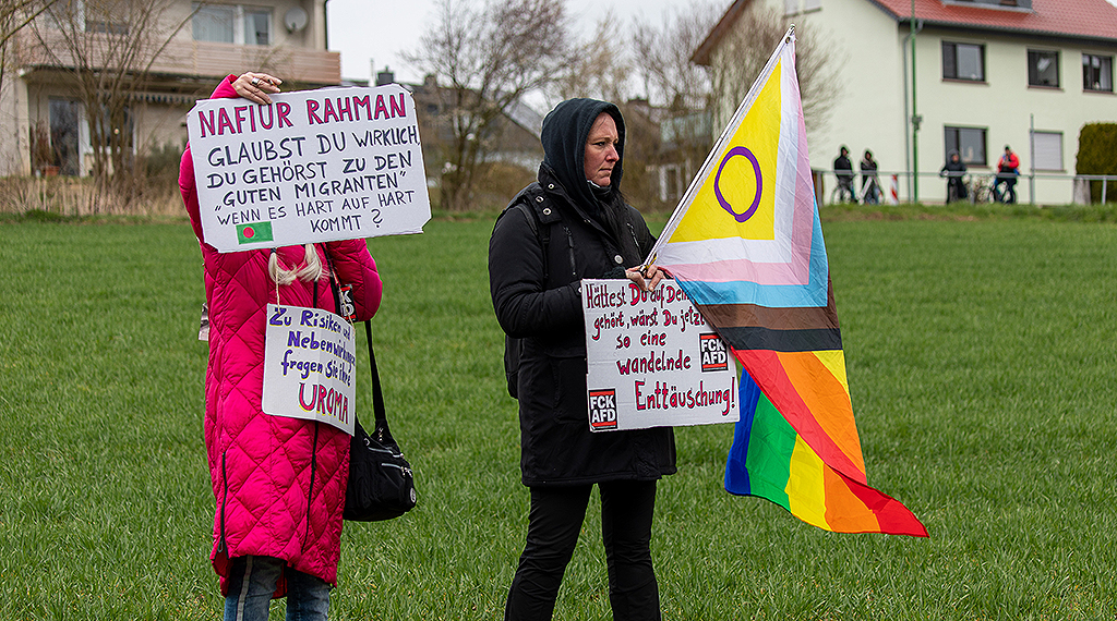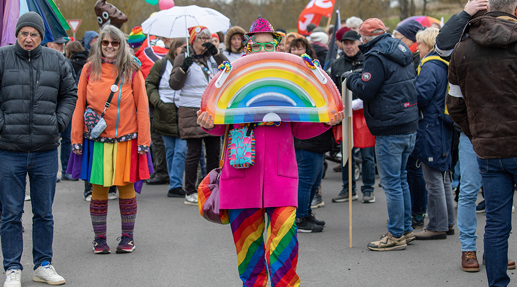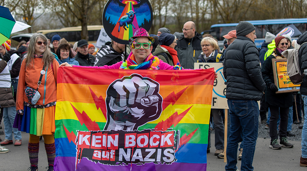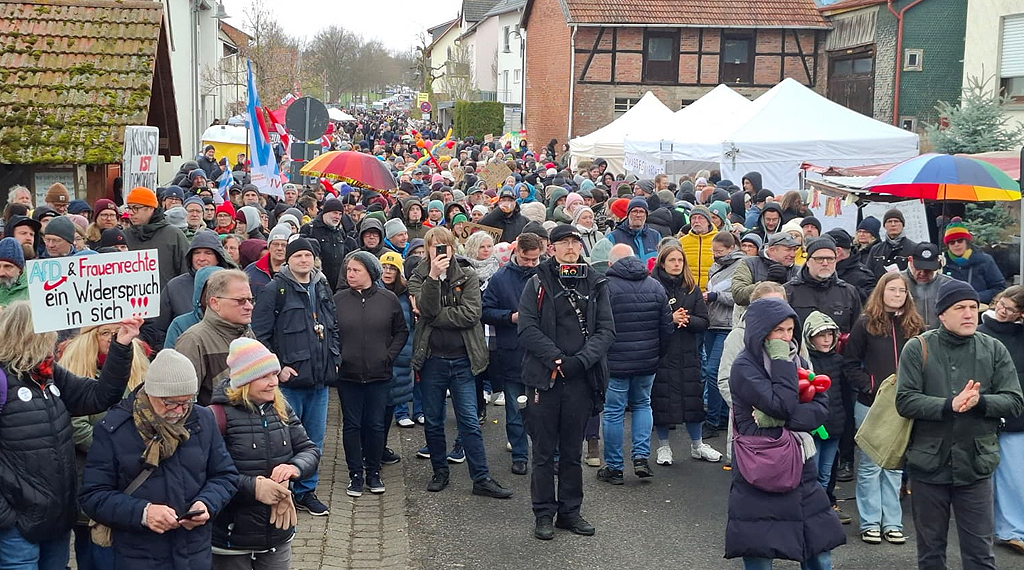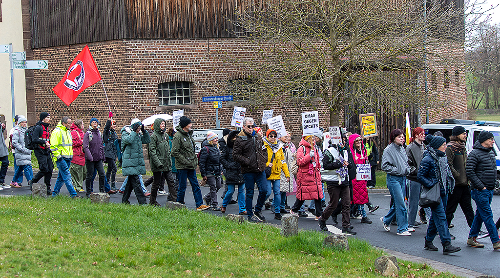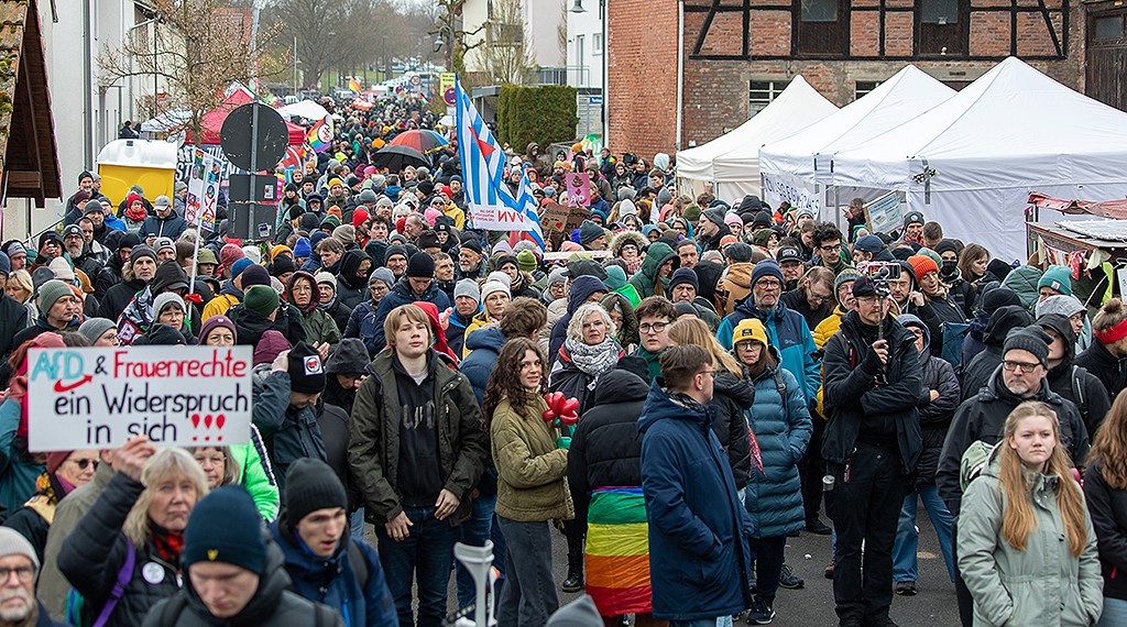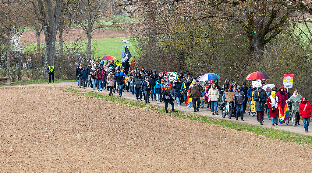 Seit den frühen Morgenstunden ist die Polizei mit einer mittleren dreistelligen Zahl an Kräften präsent, unterstützt von Pferden, Hunden und einer Drohne. Man hat sich auf ein mögliches Aufeinandertreffen vorbereitet, auf Dynamik, auf Unwägbarkeiten. Doch die bleiben weitgehend aus. Rund 550 Menschen beteiligen sich in der Spitze am Aufzug von der Olympiastraße nach Johannesberg, etwa 1.000 nehmen zeitweise am Straßenkulturfest in der Von-Mengersen-Straße teil.